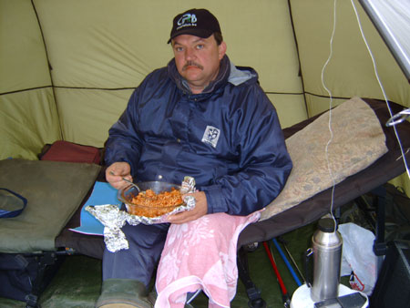 Tout est de nouveau en place et je décide de manger le repas que ma femme a préparé avec amour ainsi qu'une bonne tasse de café. Puis je m'assois sur le bed-chair quand soudain ma canne gauche commence à vivre de nouveau. Je laisse tout tomber et commence à combattre. Elle file à toute vitesse droit devant, je la laisse faire puis doucement elle revient lentement jusqu'au niveau de ma deuxième canne. Je la laisse se fatiguer puis je la mets dans l'épuisette. C'est une belle commune de 14,2 kg.