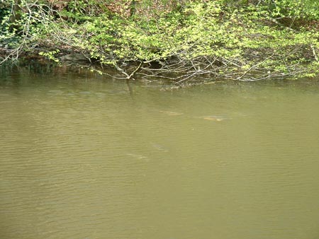 Mon explication est surtout basée sur une très bonne connaissance du plan d’eau, j’avais déjà remarqué lors de sessions précédentes que le poisson circulait presque exclusivement sur la berge opposée ; derrière le lit de la rivière dans 30 à 80 cm d’eau, les conditions météo de ces dernières semaines n’ont pas vraiment été clémentes avec à la mi-mars encore des gelées et de la neige, ces conditions climatiques ont un effet particulier sur le poisson de ce plan d’eau, il ne quitte pas ses zones de refuge donc le poste 1 au pied de la retenue un fond de 2,5 m et le poste 4 qui est l’entrée de la rivière dans le plan d’eau.