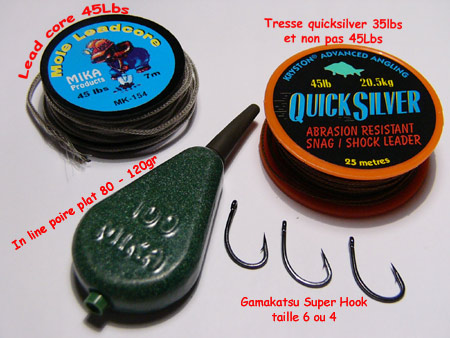 Petit à petit les solutions se profilaient à l'horizon et je dûs délaisser mon traditionnel montage de fuite pour un inline qui s'accroche moins dans les herbiers. Voici le premier élément de la solution, je couplais alors cet inline a du mole lead core (Mika Product) 45 lbs, le dernier point résidait dans le couple tresse hameçon.