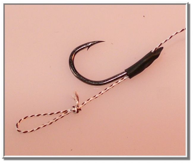 Pour finir le montage, on peut mettre une petite gaine thermo-rétractable sur l’œillet de l’hameçon (ou pour assurer un alignement optimum) et un plomb mou sur le nœud de raccord et vous obtenez un montage très souple.